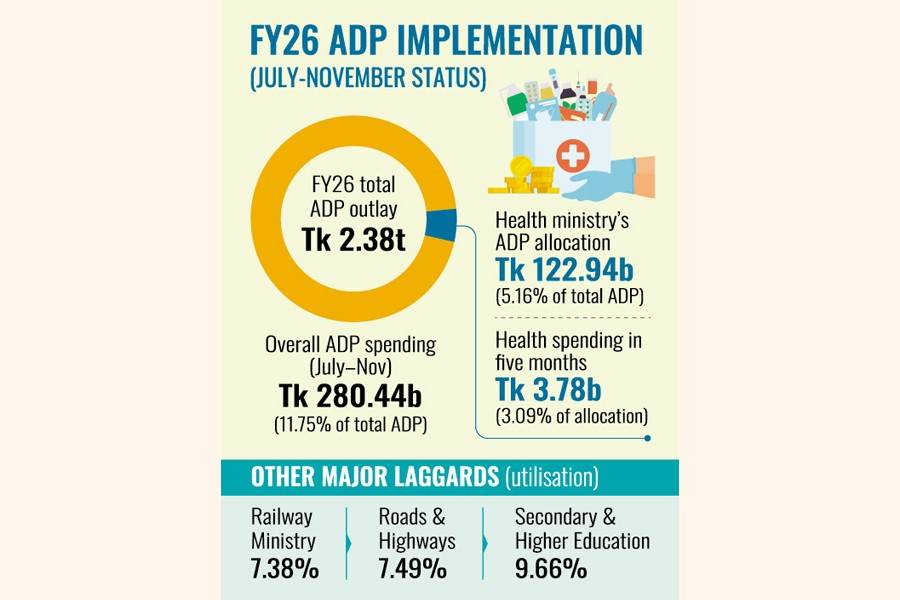 The health ministry alone received Tk 122.94 billion, 5.16 per cent of the total Tk 2.38 trillion ADP outlay, but utilised only 3.09 per cent in the first five months of the fiscal year, according to Implementation Monitoring and Evaluation Division (IMED) officials.