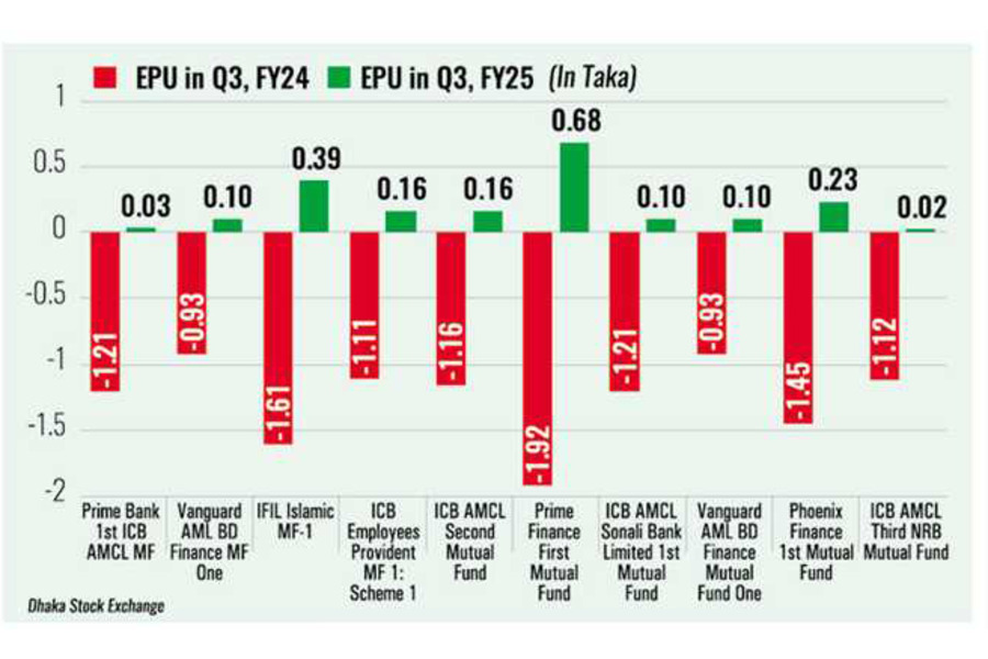 For example, ICB AMCL Sonali Bank Ltd. 1st Mutual Fund, managed by ICB Asset Management Company Ltd. (ICBAMCL), posted earnings per unit (EPU) of Tk 0.10 in Q3 FY25, compared to a loss of Tk 1.21 per unit in Q3 FY24.