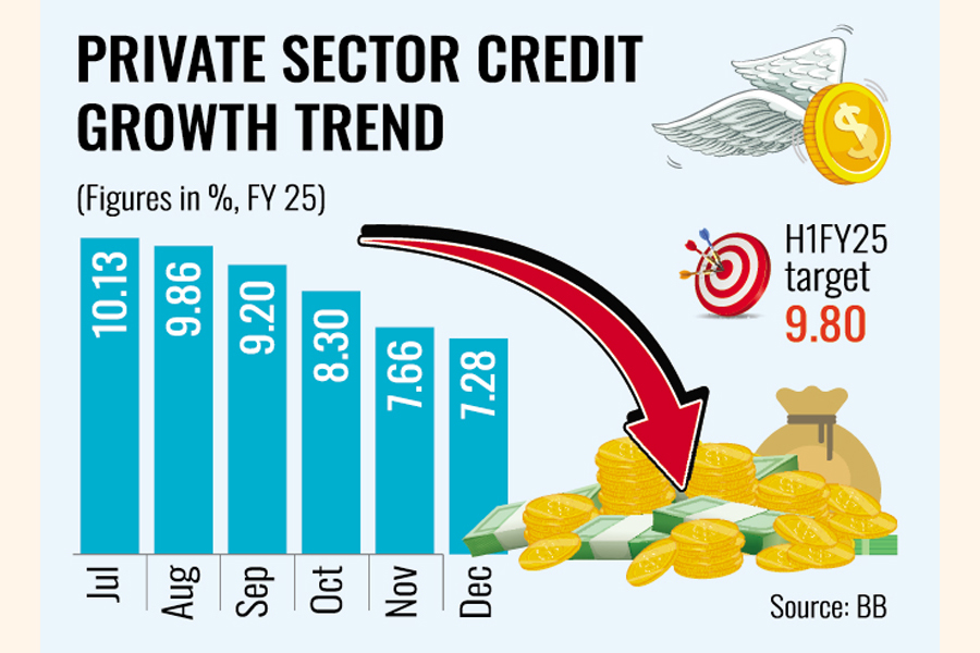 The growth in credit flow to private sector came down to 7.28 per cent in December 2024 on a year-on-year basis from 7.66 per cent a month before, according to the central bank's latest statistics, released Thursday.