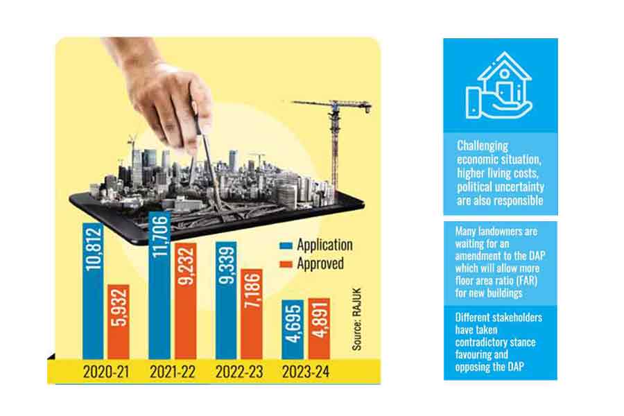 According to data available with the RAJUK, the number of applications dropped by almost 50 per cent in the last fiscal year (FY) 2023-24 to only 4,695 which was 9,339 in the previous FY (2022-23). The number of applications was 10,812 in the FY 2020-2021 and 11,706 in the following fiscal year.