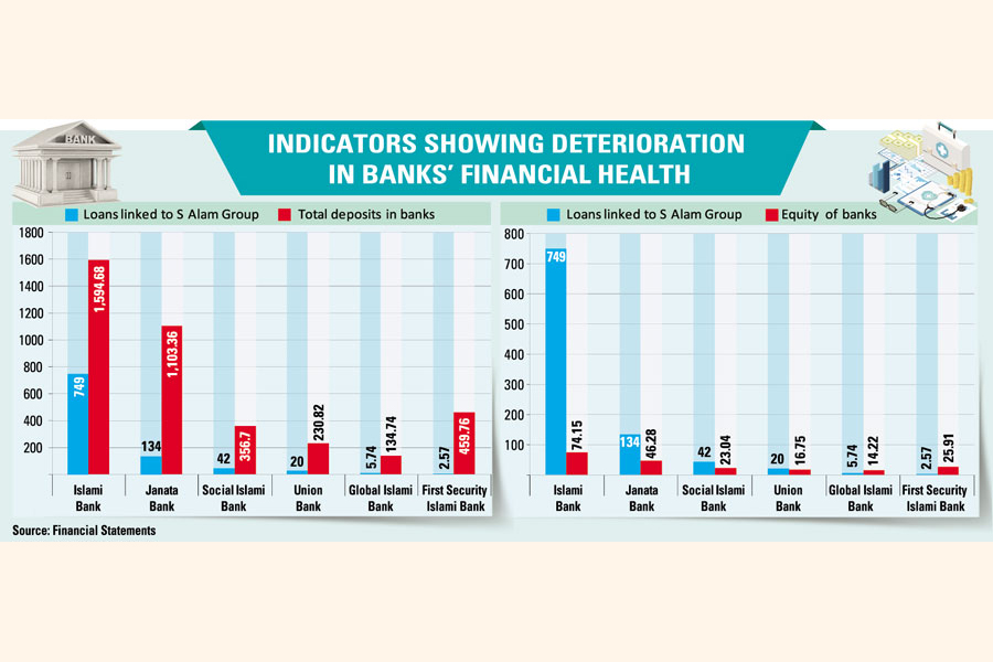 Altogether, S Alam Group borrowed Tk 953.31 billion from six banks whereas the lenders' aggregated equity is Tk 200.35 billion. First Security Islami Bank is the only one among the six banks which lent 10 per cent, within the limit, of its capital to the group.