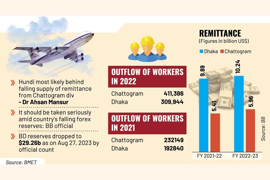Chattogram division accounts for the highest number of workers migrating from Bangladesh but its annual remittance receipt counts almost half of Dhaka division's, giving some credence to suspected forex flight.