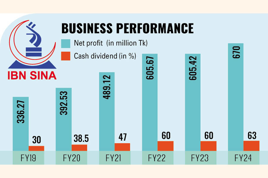 Based on its profits, The Ibn Sina's Board of Directors has declared a 63 per cent cash dividend. However, despite this announcement, its stock fell 5 per cent to Tk 329.40 on the Dhaka Stock Exchange.