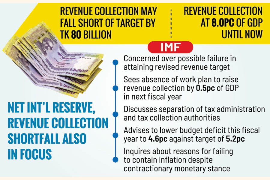 Revenue and forex reserves evoke major concerns as an International Monetary Fund (IMF) delegation starts stocktaking on Bangladesh's achievements against various targets set in a lending package for restoring macroeconomic stability deemed under stress.