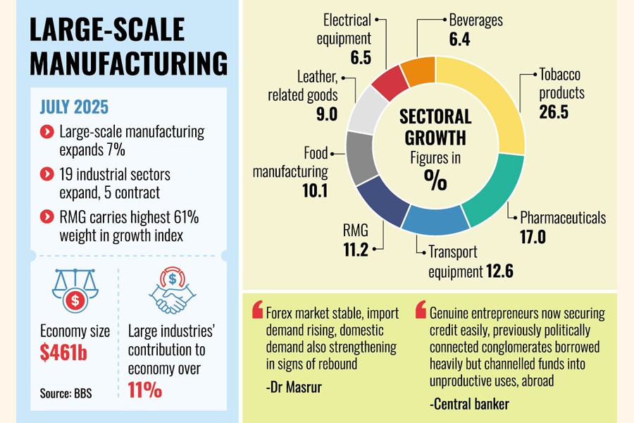 Bangladesh's large-scale manufacturing output expanded nearly 7.0 per cent in July, the first month of the 2026 fiscal year, according to official data.