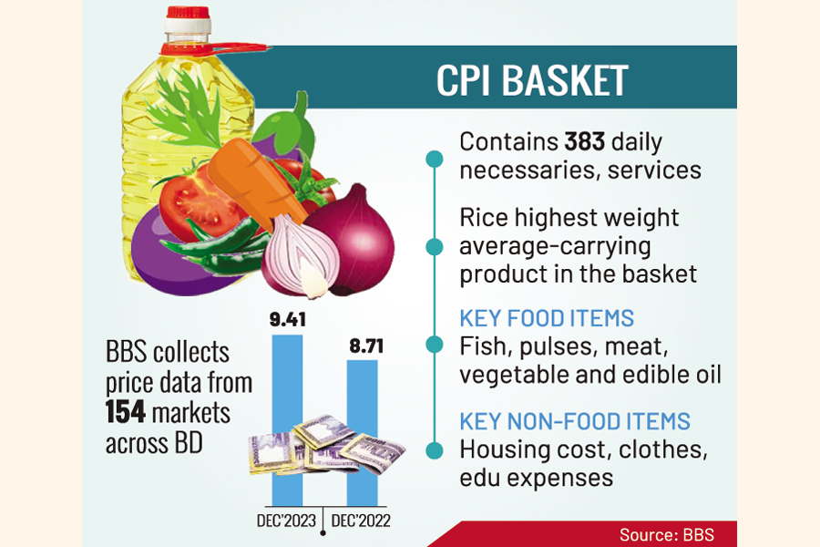 Based on weighted average for each of the 749 varities from 383 daily necessaries and services in the Consumer Price Index (CPI) basket, consumers needed to spend the Tk 9.41 additional amount of money in December last. The price was Tk100 a year ago in December 2022, an FE analysis has found.