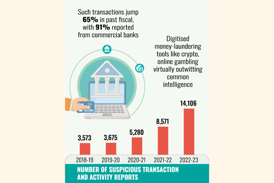 Suspicious financial transactions and activities in Bangladesh's financial sector find a spurt as intelligence reports around 65-percent annualised rise in the past fiscal.