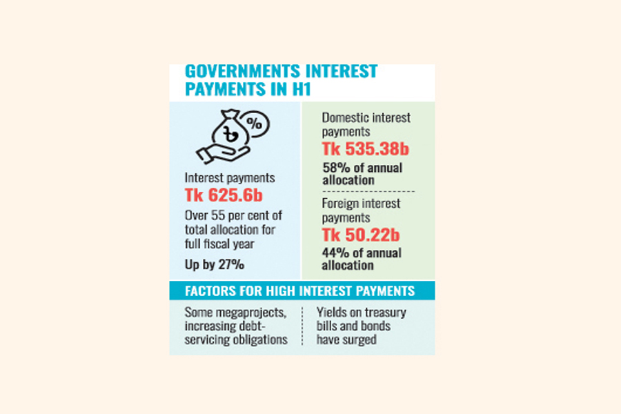 Official statistics show the July-December 2024 interest payments by the government, totalling Tk 625.6 billion, account for over 55 per cent of the total allocation for this purpose for the entire fiscal year 2024-25 ending next June 30.