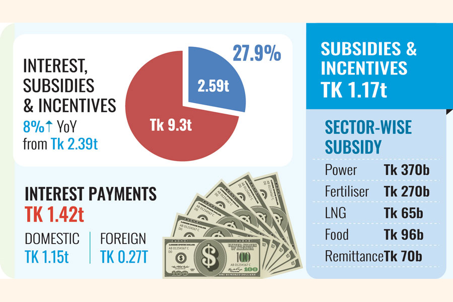 Interest payments, subsidies, incentives and cash loans could gobble up big pies of the next budget as the government earmarks over Tk 2.59 trillion on this account and officials predict higher energy costs could bloat the figure.