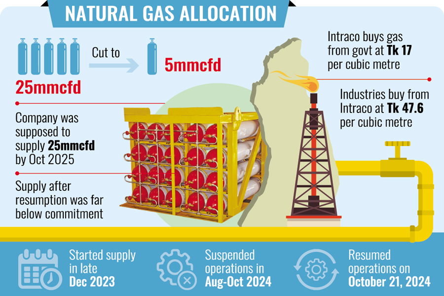 Intraco was supposed to supply around 5.0 mmcfd of gas to the gas-starved factories in Gazipur and its adjacent areas where piped gas pressure remains low.