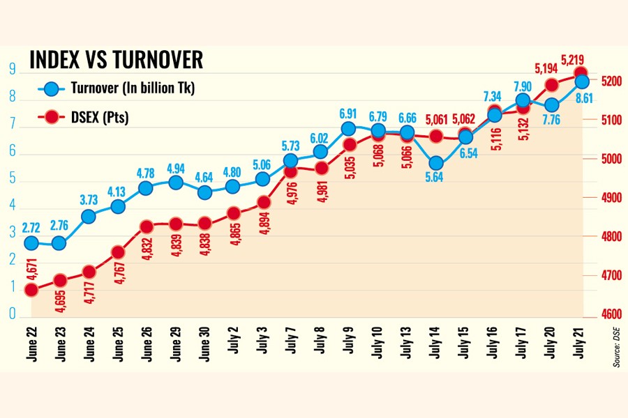 The DSEX, key index of the Dhaka bourse, finally was up more than 25 points or by 0.49 per cent to 5,219 as the session drew to a close. It regained 158 points in the past five sessions while the market cap surged by Tk 169 billion.
