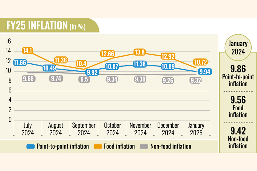 A decline of approximately 1.0-percentage point from the December rate took the overall inflation down double-digit level last month, Bangladesh Bureau of Statistics (BBS) revealed Tuesday.