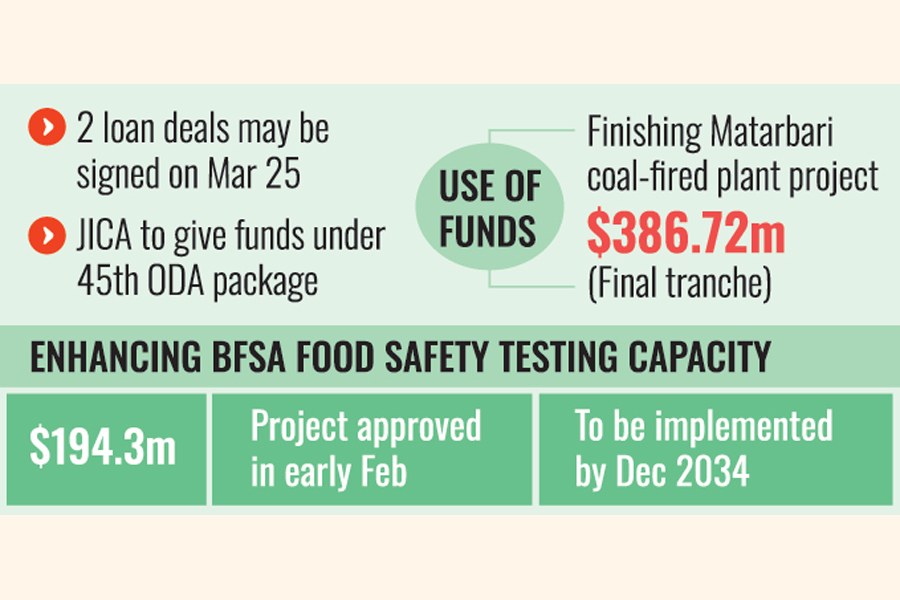 "We are going to sign loan deals on March 25. The loans will be provided under the ongoing 45th ODA package. The funds will be utilized for completing Matarbari coal-fired power-plant project and ensuring food safety in Bangladesh," said a senior MoF official.