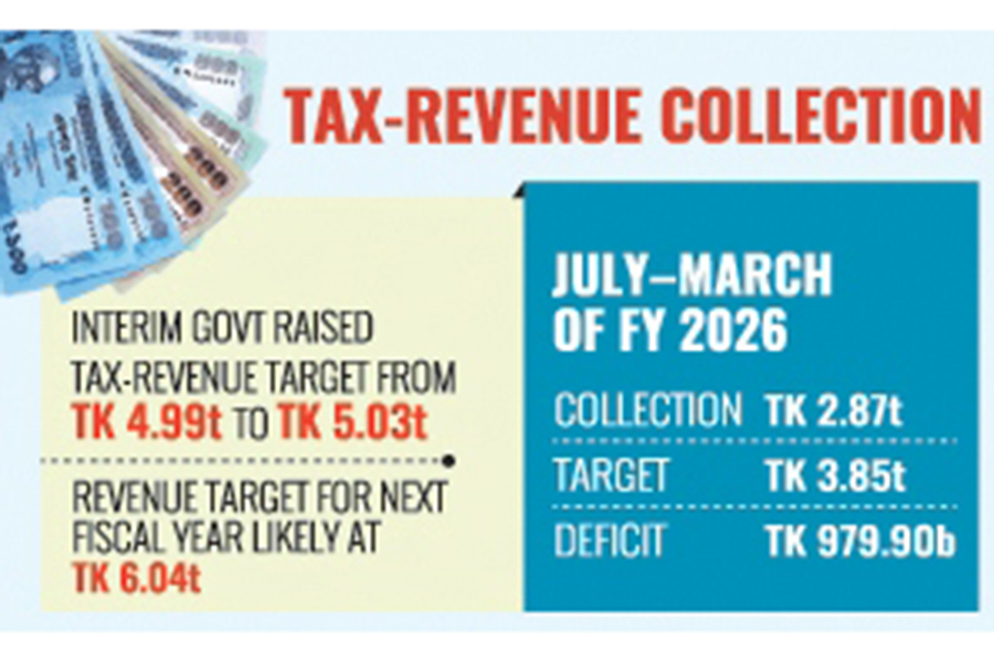 Over the July-March period, the NBR had collected Tk 2.87 trillion against a target of Tk 3.85 trillion, leaving a deficit of Tk 979.90 billion.