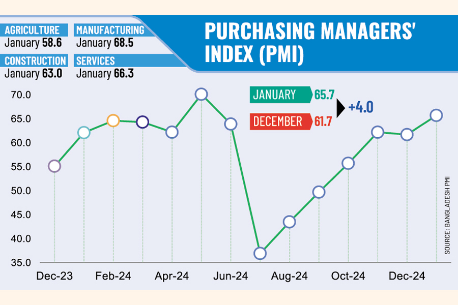 Bangladesh's key economic sectors expanded faster month- on-month in January, as reflected in the Bangladesh Purchasing Managers' Index (PMI) that recorded a reading of 65.7, up 4.0 points from December's.