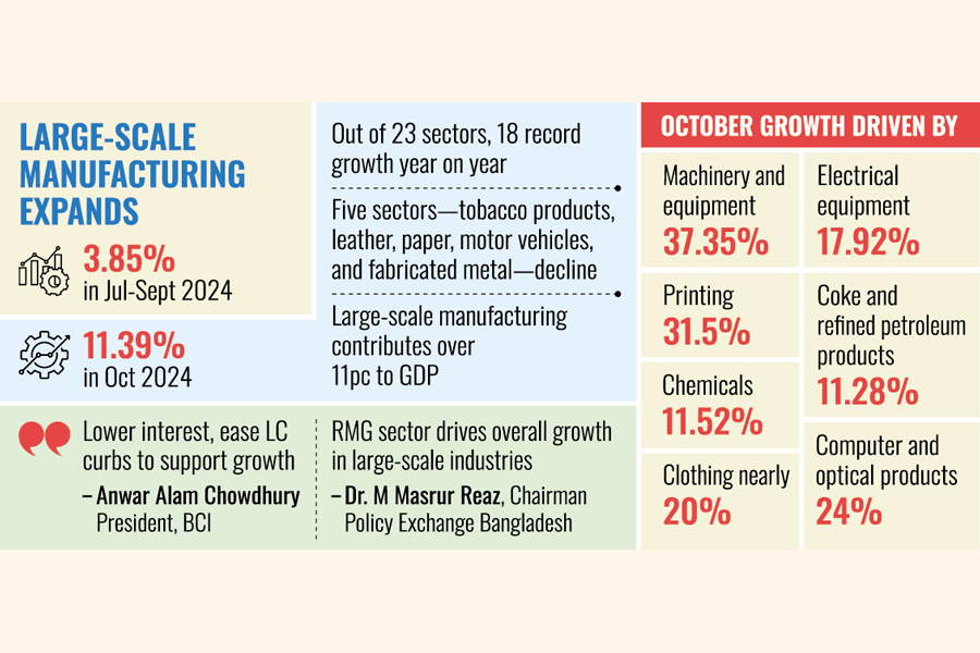 Dr M. Masrur Reaz, Chairman and CEO of Policy Exchange Bangladesh, attributes the growth in large-scale manufacturing to seasonal factors and a rebound in the RMG sector. "The RMG sector, which makes up over 60 per cent of the index, grew by nearly 20 per cent, driving overall growth in large-scale industries," he says.