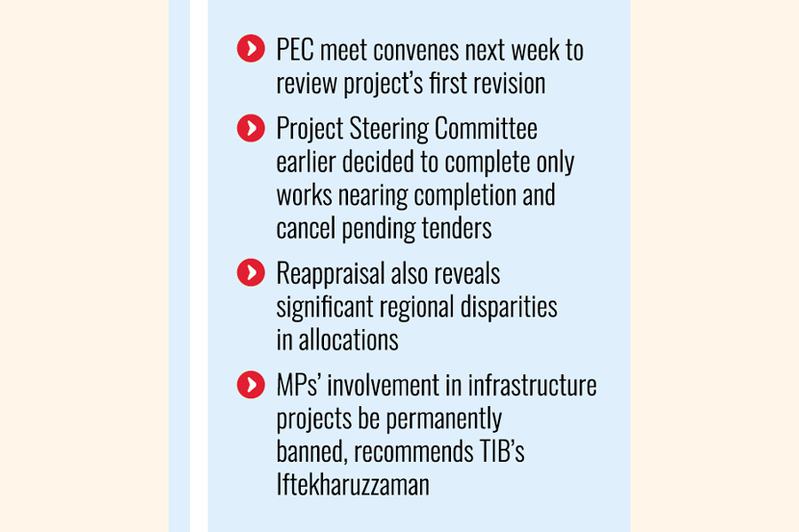 A much-debated project distributing development works for Members of Parliament (MPs) during the deposed Awami League regime makes a comeback with cost and time escalations despite being earlier forsaken by the current interim government, sources say.