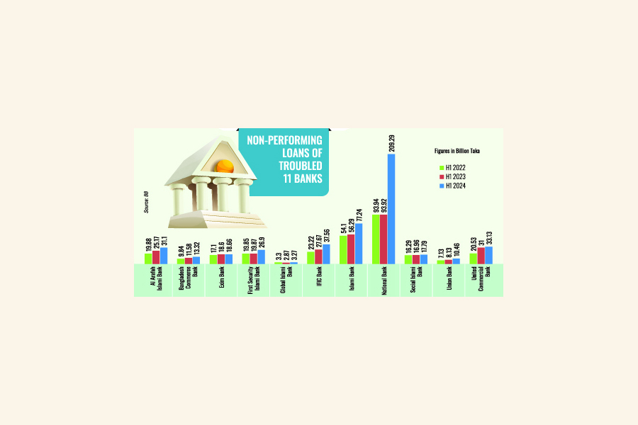 In a notable development, the NPLs of National Bank more than doubled in H1 2024 compared to the same period in 2023, jumping by nearly 123 per cent to Tk 209.29 billion, the highest among all PCBs during that time, from Tk 93.92 billion a year earlier, according to the central bank statistics.
