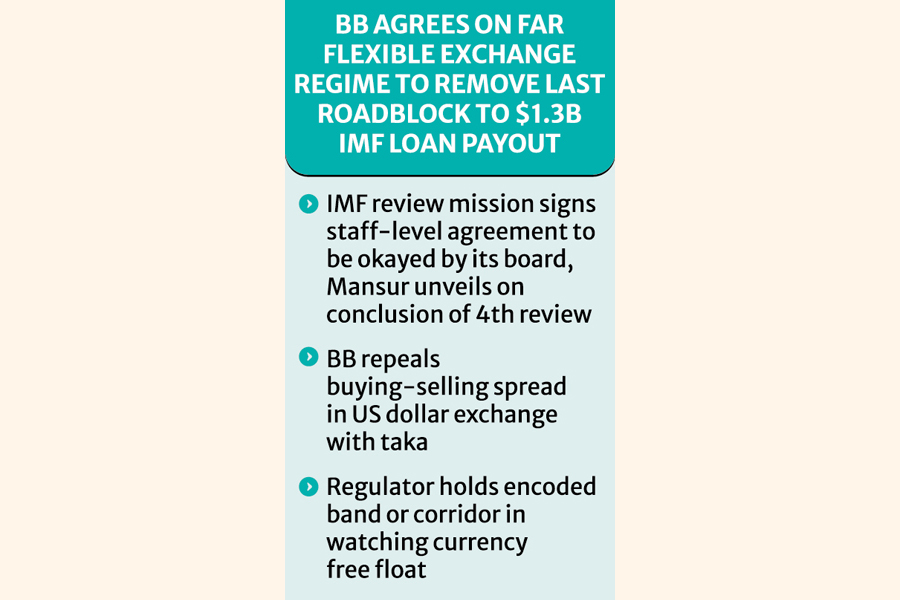 With the adoption of such flexibility in taka-dollar exchange, the Bretton Woods institution agrees, after series of parleys, to release fourth and fifth tranches (each equivalent to $650 million) of the loan by next month, according to the BB governor, Dr Mansur.