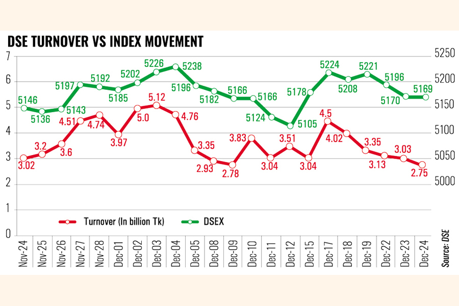 Turnover, a crucial indicator of the market, stood at Tk 2.75 billion on the country's premier bourse on the day, falling further by 9 per cent from the previous day.