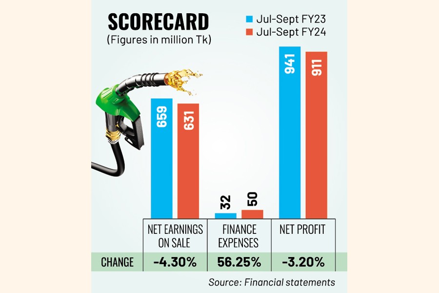 The company's net earnings from petroleum product sales dropped by 4.30 per cent year-on-year to Tk 630.62 million in July-September quarter.