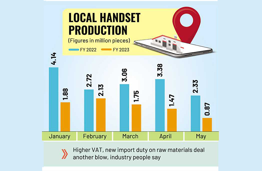 Mobile-phone-handset manufacturing in Bangladesh declined 41 per cent in May from the previous month while sales also contracted as high inflation and costly dollar dent the fledging import-substitution industry, sources say.