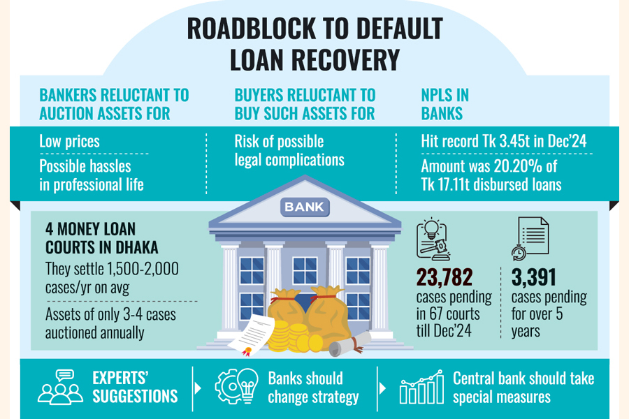 Nurul Huda, head clerk of the Money Loan Court-4 in Dhaka, told The Financial Express properties involved in only three to four cases are auctioned annually. Mohammad Shahadat Hossain, head clerk of the Money Loan Court-3 in Dhaka, said the same.