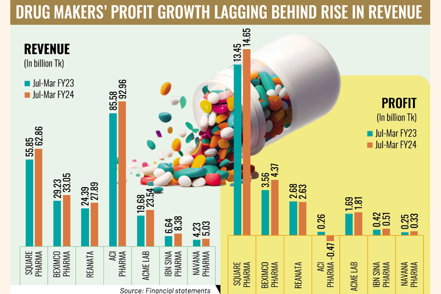 The collective sales of seven major drug makers listed on the Dhaka Stock Exchange (DSE) grew 12.5 per cent year-on-year to Tk 254 billion in July-March of FY24. But their net profits increased only 6.8 per cent year-on-year to Tk 23.83 billion during the period, according to their unaudited financial statements.