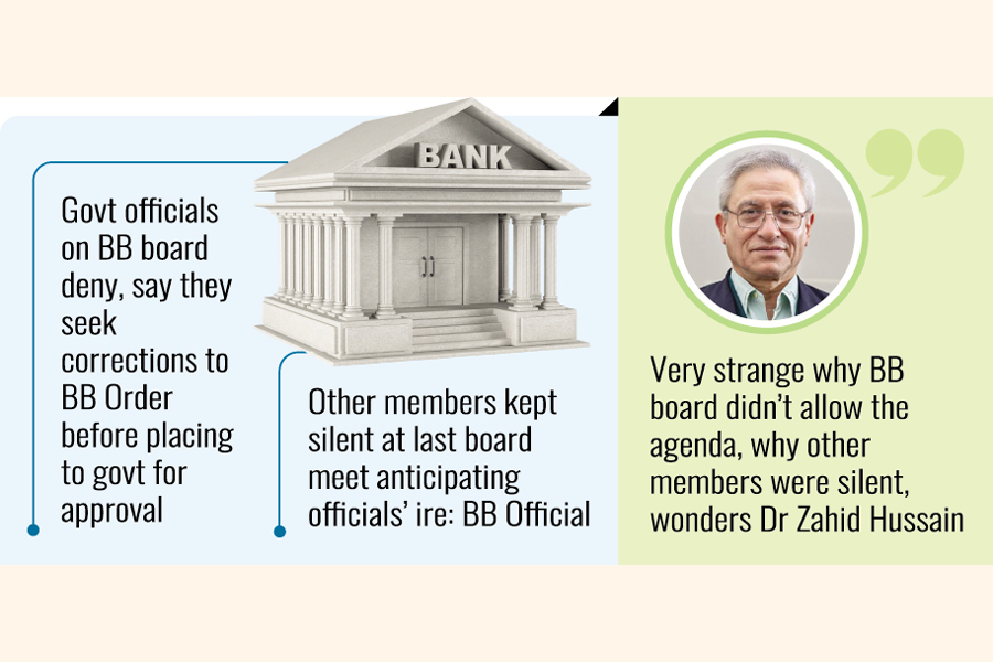 Dr Zahid Hussain, former lead economist of World Bank's Dhaka office, says amendment of the BB order is not something the board did not know. "I don't understand why the BB board did not allow presentation of the matter and why the other members were silent."