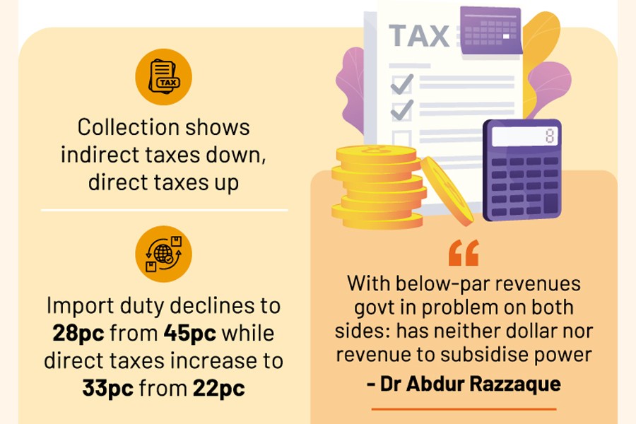 NBR officials say share of indirect taxes is gradually going down in the tax-revenue collection. Import duty has declined to 28 to 29 per cent from earlier 45 per cent while direct tax increased to 33 per cent from 22 per cent.