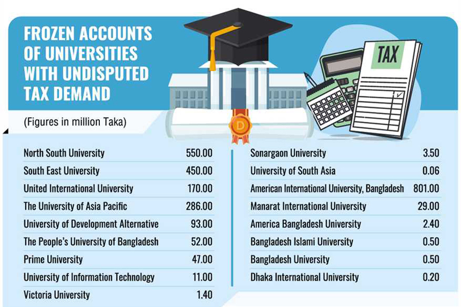 At present, nearly Tk 2.5 billion in taxes remained unpaid by some 22 universities and their bank accounts have been frozen by the taxmen since March 15, 2024.
