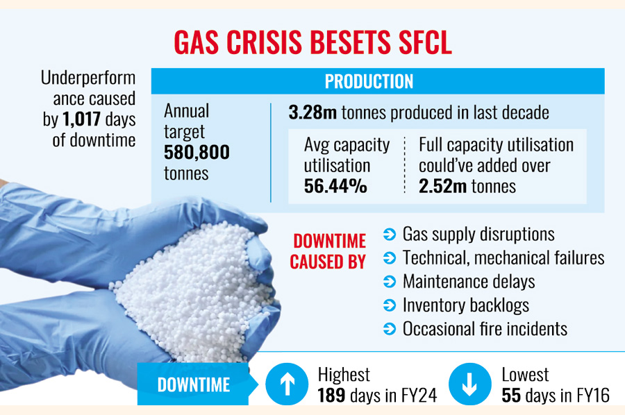 The report shows that the plant produced a total of 3.28 million metric tons of urea over the past decade, with an average capacity utilisation rate of 56.44 per cent-ranging from a low of 41.12 per cent in FY24 to a peak of 72.81 per cent in FY22. Full-capacity utilisation could have added over 2.52 million metric tons of fertiliser, significantly boosting agricultural output while saving foreign currency by cutting import dependence.