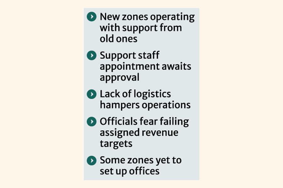 Expanding tax nets for a must-have boost to Bangladesh's deficient revenues falters as the National Board of Revenue (NBR) appointed top officials to newly created tax zones mostly sans supporting staff.