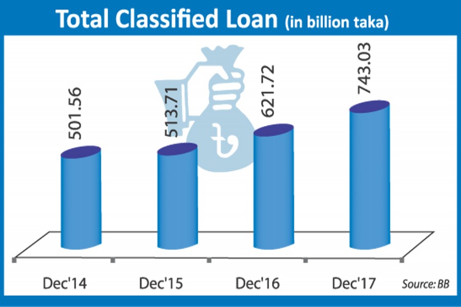 The classified loans cover substandard, doubtful and bad/loss of total outstanding credits, which stood at Tk 7,981.96 billion as on December 31 last. The amount was Tk 6,739.20 billion a year ago.