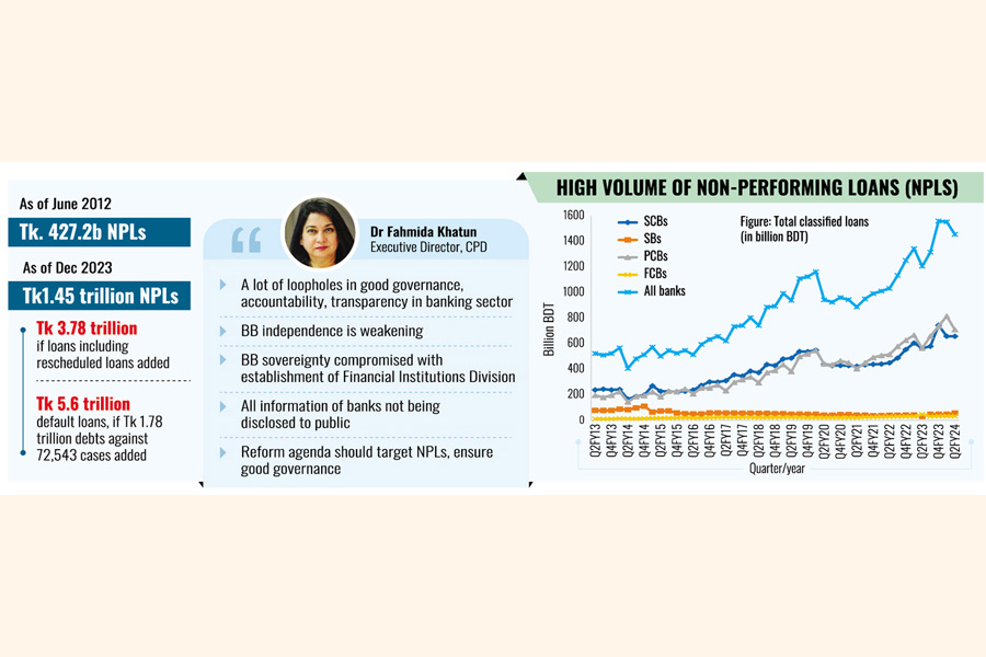 Such portrayal of state of the country's banking industry came in a presentation made by Dr Fahmida Khatun, executive director of the Centre for Policy Dialogue, at a cutting-edge meet Thursday on the sector situation fraught with numerous problems.