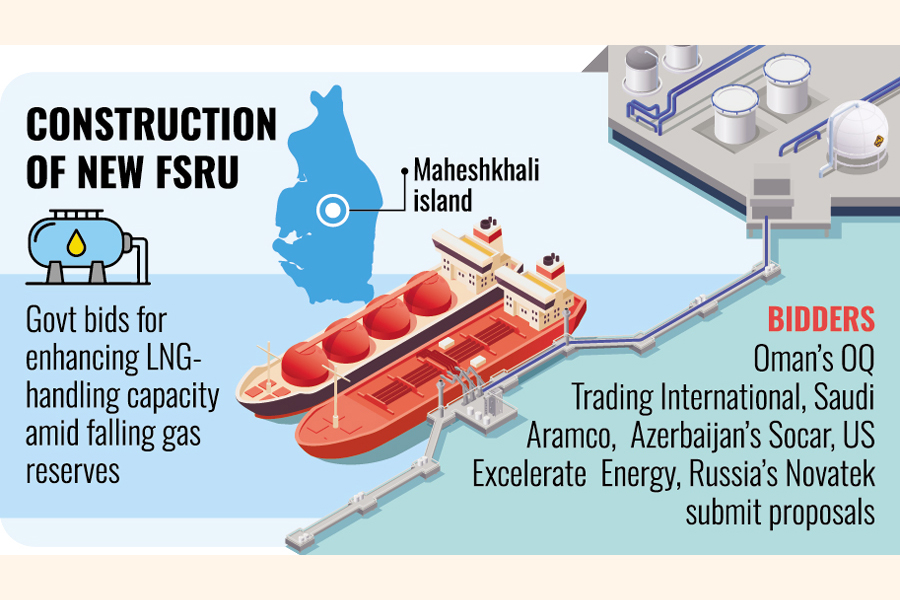 Half a dozen international firms are vying for contract to construct a new floating storage and regasification unit (FSRU) at Moheshkhali island as Bangladesh opts for enhancing LNG-handling capacity amid falling domestic gas reserves against rising demand.