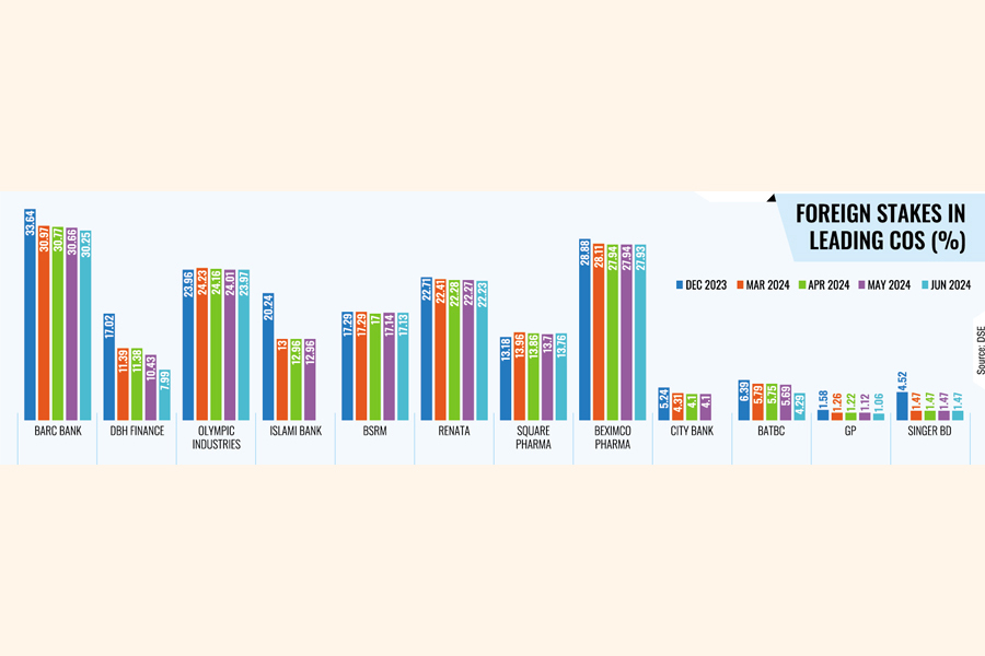 DBH Finance saw the highest erosion as foreigners' stake was 17.02 per cent in January this year, which plunged to 7.99 per cent in June, followed by Singer Bangladesh, whose foreign holdings declined to 1.47 per cent from 4.52 per cent during the time.