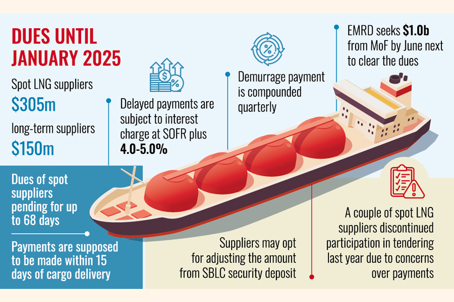 Official sources said Petrobangla has been failing to clear the overdue payments to both long-term and spot LNG suppliers, and until late January, majority of the overdue payments remain pending with the spot LNG suppliers to the tune of around $305 million and to long-term suppliers around US$150 million.