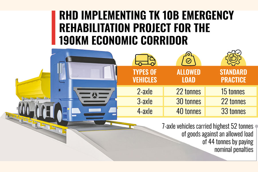 Presenting a paper at a stakeholders' meeting at RHD recently, Dr Mohasin also highlighted that the damage factor of vehicles due to overloading was 7.4 times in 2-axle vehicles, 2.27 times in 3-axle vehicles and 2.3 times in 4-axle.