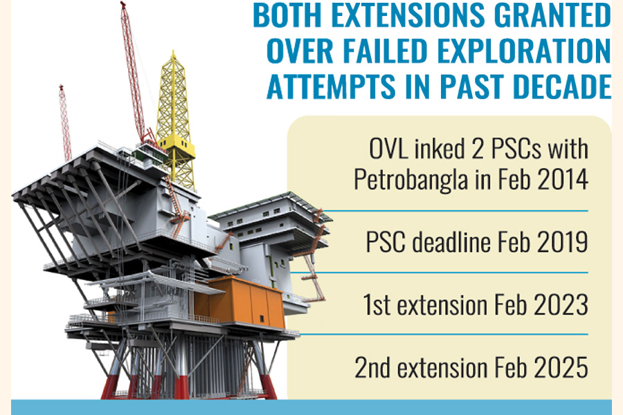 Officials said OVL signed two PSCs with Petrobangla in February 2014, securing rights to explore shallow sea blocks SS-04 and SS-09. These contracts were initially set to expire in February 2019.
