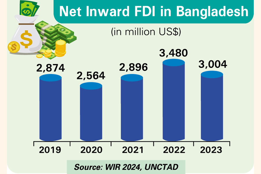 The net inward FDI in Bangladesh, however, declined by 13.70 per cent in the last year to $3.0 billion from $3.48 billion, according to the UNCTAD report.