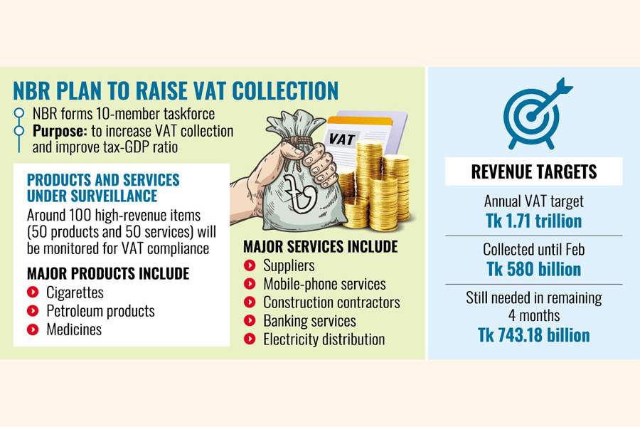 Until February, the NBR had collected Tk 580 billion in VAT. To get to the goal, the revenue authority will need to collect Tk 743.18 billion more during the remaining four months of the fiscal year.