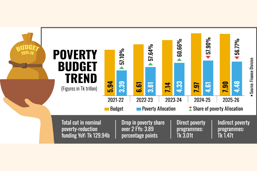 The national budget for FY 2025-26, proposed by Finance Advisor Dr Salehuddin Ahmed on June 2, includes Tk 3.01 trillion in direct poverty reduction spending, or 38.10 per cent of the total budget, and Tk 1.47 trillion (18.66 per cent) in indirect spending with potential poverty alleviation impact.