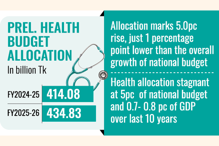 The Ministry of Health and Family Welfare has set a preliminary budget allocation of Tk 434.83 billion for the next fiscal year (2025-26), marking a Tk 20.75 billion increase from the current fiscal year's allocation of Tk 414.08 billion.