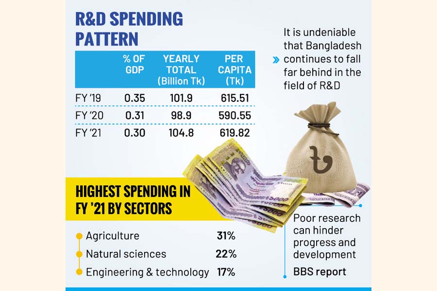 "Despite many successes, it is undeniable that Bangladesh continues to fall far behind in the field of R&D," said the BBS report styled "Research and Development (R&D) Survey 2022".