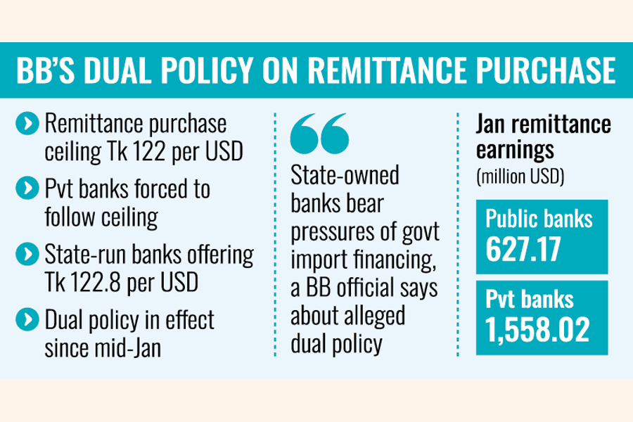 "Now, public banks are buying remittance as high as Tk 122.80 per dollar till today (January 31). This is a dual policy of the regulator," he said.