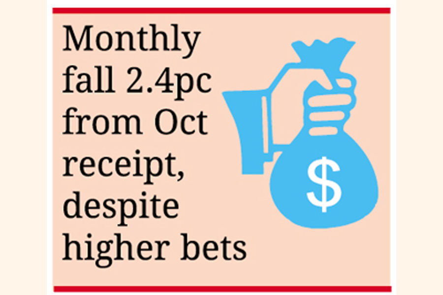 Monthly remittance receipts fell in November to US$1.93 billion despite higher bets, when the greenback is much needed to prop up Bangladesh's depleting foreign-exchange reserves.
