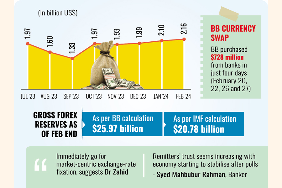 According to the BB currency-swapping data, the BB purchased $728 million in deals of just four days (February20, 22, 26 and 27), which pushed up the gross forex reserves under the regulator's calculation method to stand at $25.97 billion. The figure of foreign-exchange reserves in Bangladesh was $20.78 billion in IMF arithmetic at the end of February 2024.