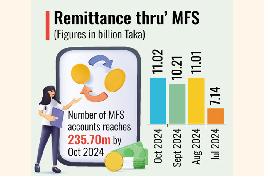 According to Bangladesh Bank data, Tk. 11.02 billion in inward remittances were processed through MFS platforms in October 2024, with the e-money balance for the month reaching Tk. 139.22 billion.
