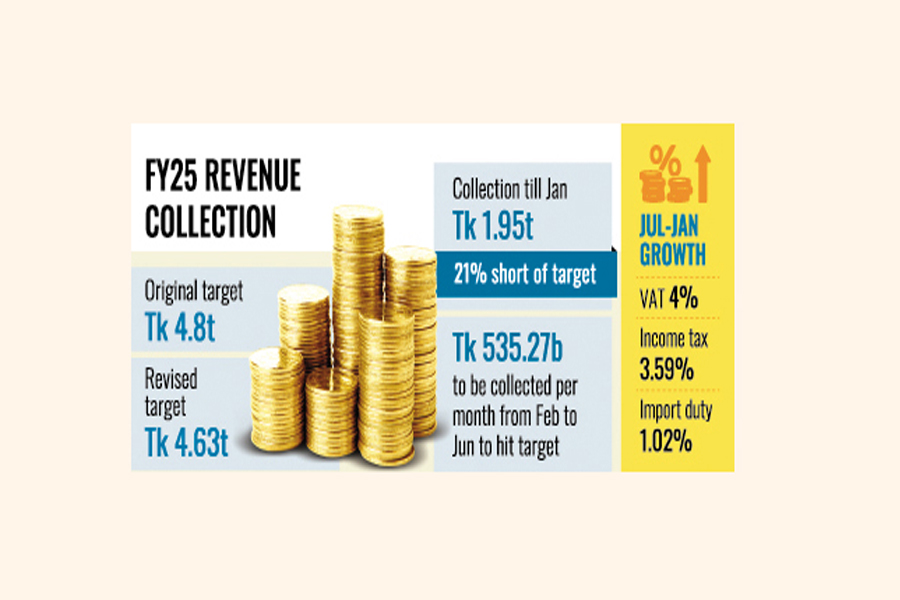 To achieve the FY25 target, the National Board of Revenue (NBR) will have to collect Tk 535.27 billion per month from February to June.